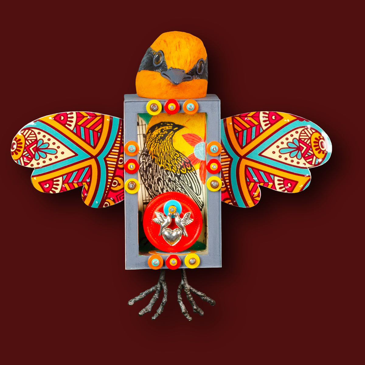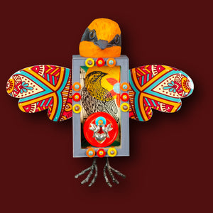 Mixed media wall hung olive warbler sculpture with collage, block print, checker, tin wings, love birds and cast bronze feet.